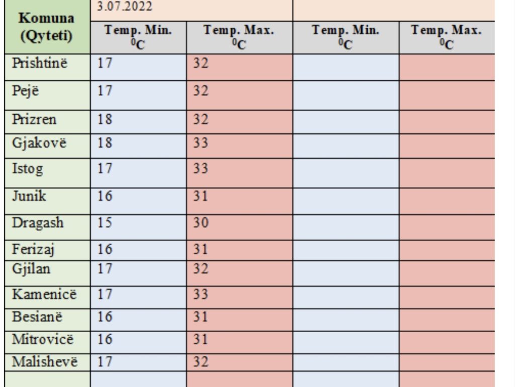 Temperaturat minimale do të lëvizin ndërmjet 15-18 gradë Celsius, ndërsa maksimalet e ditës parashihen të lëvizin ndërmejt 30-33 gradë Celsius.