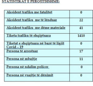 Gjatë kësaj periudhe kanë ndodhur 22 aksidente me të lënduar dhe 41 me gjoba trafiku, përcjell Klankosova.tv.