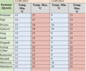 “Sa i përket temperaturave , parashihet rritje, sidomos në vlerat e maksimaleve , derisa minimalet do shënojnë ulje në një shifrorë. Minimalet do të lëvizin ndërmjet 7-13 gradë Celsius, ndërsa maksimalet e ditës parashihen të lëvizin ndërmjet21-29 gradë Celsius. Do të fryjë erë e lehtë deri mesatare nga drejtimi i verilindjes dhe juglindjes”, thuhet në njoftimin e IHMK-së.
