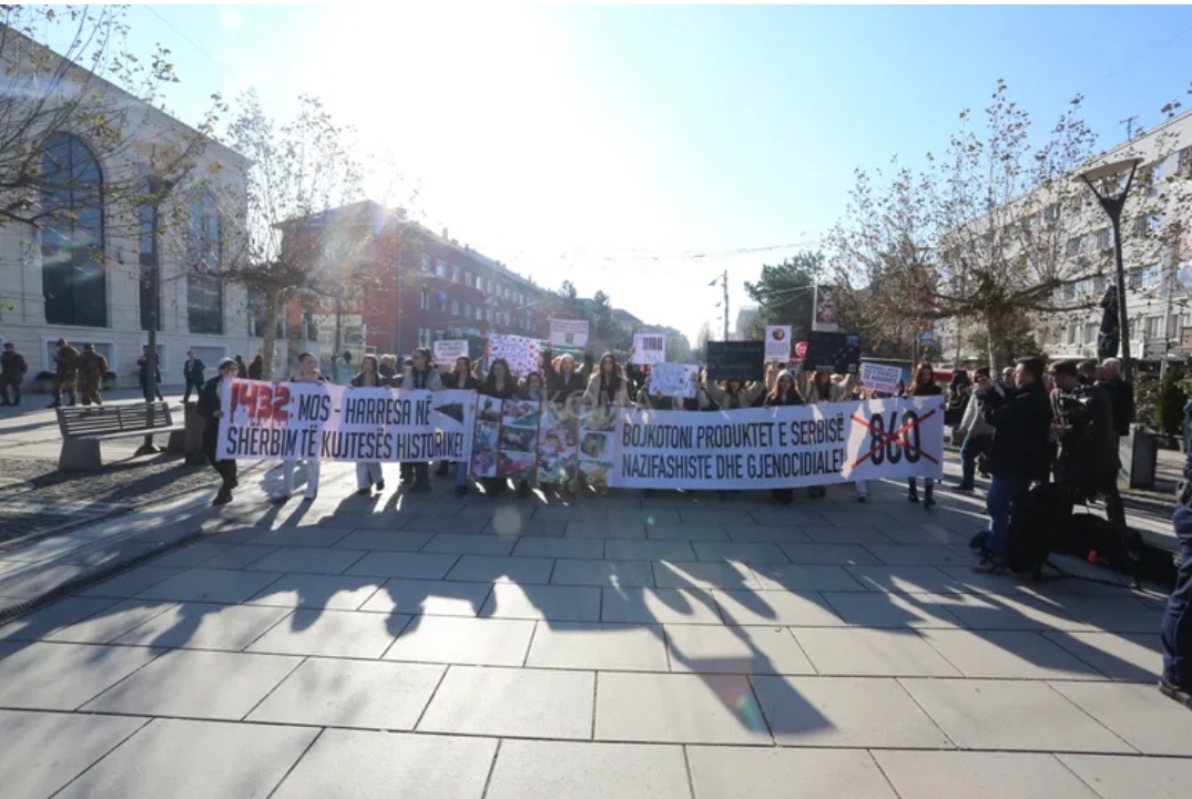 Studentët kanë protestuar me sloganet “Bojkotoni produktet e Serbisë nazifashiste dhe gjenocidale” dhe të tjera, bashkangjitur me fotografi nga masakrat ndaj civilëve shqiptarë të kryera nga forcat serbe gjatë luftës në Kosovë.