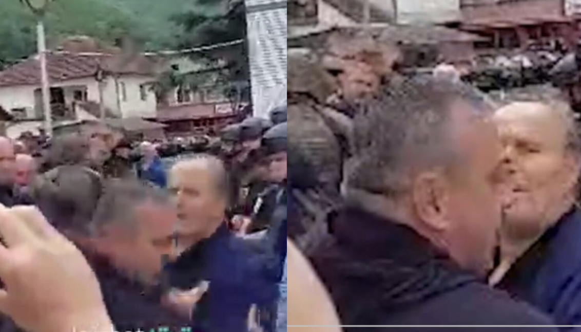 Ndërsa njëri prej protestuesve është afruar të flasë me një prej policëve, dikush e ka tërhequr për ta ftuar që të kthehet prapa.