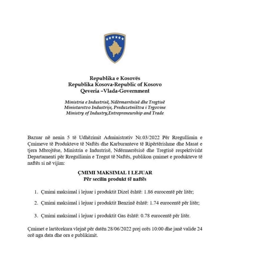 “Çmimi maksimal i lejuar i produktit Dizel është: 1.86 eurocentë për litër; Çmimi maksimal i lejuar i produktit Benzinë është: 1.74 eurocentë për litër; Çmimi maksimal i lejuar i produktit Gas është: 0.78 eurocentë për litër. Çmimet e lartëcekura vlejnë për datën 28/06/2022 prej orës 10:00 dhe janë valide 24 orë nga data dhe ora e publikimit”, njofton ministria.