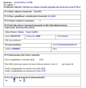 Të martën, Zyra e Prokurimit në Policinë e Kosovës e ka shpallur kompaninë Beni Dona Plas Sh.P.K. fituese të llotit të parë, e cila ka çmim të poentuar 36.26 euro, bazuar në njoftimin për dhënie kontrate të publikuar në e-prokurimi.