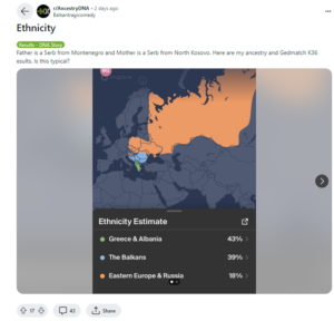 “Babai është serb nga Mali i Zi dhe nëna është serbe nga veriu i Kosovës. Këtu janë prejardhja ime dhe rezultatet e Gedmatch K36. A është kjo tipike?”, shkruan ai i habitur, në pritje të ndonjë “shkencëtari” në komente për ta ngushëlluar me pseudofakte.